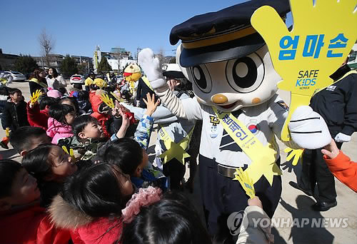 | △ '엄마손' 든 포돌이와 파이팅 (서울=연합뉴스) 임헌정 기자 = 서울 종로구 재동초등학교에서 국제아동안전기구 세이프키즈코리아 관계자들과 재동초 1학년 어린이들이 노란색 피켓인 '엄마손'을 든 경찰 마스코트 포돌이와 하이파이브를 하고 있다. 2015.3.10 kane@yna.co.kr |