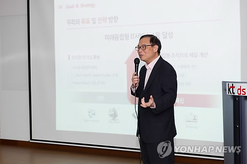 | △ 신 비전체계 발표하는 김기철 KT DS 사장 (서울=연합뉴스) 11일 서울 방배동 KT DS 사옥에서 김기철 KT DS 사장이 신 비전체계를 발표하고 있다. (KT DS 제공) |