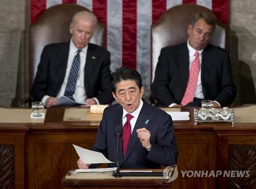 | △ 아베 총리의 4월29일 미 의회 연설(AP=연합뉴스 DB) |