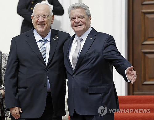 | △ 어깨 맞댄 獨·이스라엘 대통령 (베를린 AP=연합뉴스) 레우벤 리블린 이스라엘 대통령(왼쪽)이 11일(현지시간) 독일 베를린을 방문, 요아힘 가우크 독일 대통령의 환영을 받고 있다. marshal@yna.co.kr |