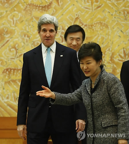 | △ 박근혜 대통령이 2014년 2월 13일 오후 청와대에서 존 케리 미국 국무장관을 접견, 자리를 안내하고 있다. (연합뉴스 자료사진) |