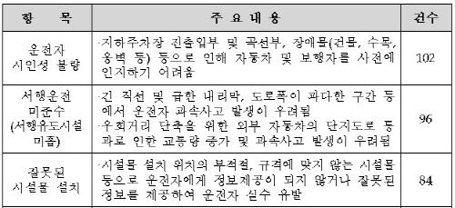 공단은 2012년부터 최근까지 110개 아파트단지의 도로를 점검한 결과 보도 및 횡단보도 부재, 서행운전 미준수 및 서행 유도시설 부족, 곡선부 도로 등에서의 운전자 시야확보 불량 등이 주요한 위험요인으로 나타났다.
