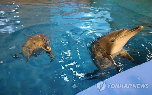 | △ 남방큰돌고래 태산이·복순이 바다로 돌아간다 (과천=연합뉴스) 이정훈 기자 = 12일 경기도 과천시 서울대공원 해양관에서 언론에 공개된 남방큰돌고래 태산이와 복순이(왼쪽). 해양수산부는 불법 포획된 후 2013년부터 서울대공원에서 보호한 태산이와 복순이를 야생 방류하기로 했다고 이날 밝혔다. 태산이와 복순이는 오는 14일 제주 함덕 해역으로 옮겨져 방류를 위한 2개월간의 야생 적응 훈련 뒤 바다로 돌아간다. 2015.5.12 uwg806@yna.co.kr |