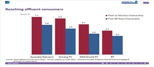 아리랑TV에 따르면 태국 방콕, 인도네시아 자카르타, 필리핀 마닐라, 싱가포르의 시청자 6천863명을 대상으로 한 2014년 1~4분기 시청도달률 조사에서 아리랑TV의 4개 도시 합계 월간 시청도달률이 4.9%로 조사됐다. NHK월드는 3.9%, 러시아투데이는 3.5%였다.