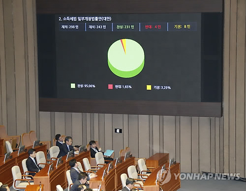 | △ 소득세법 일부개정법률안 통과 (서울=연합뉴스) 이상학 기자 = 12일 국회에서 열린 제 333회 국회(임시회) 제1차 본회의에서 소득세법 일부개정법률안이 통과되고 있다. |