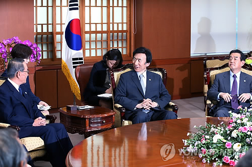 | △ 윤병세, 일본 경제인 대표단 접견 (서울=연합뉴스) 전수영 기자 = 윤병세 외교부 장관이 12일 오후 서울 세종로 외교부를 예방한 일본 경제인 대표단 사사키 미키오(佐佐木幹夫) 한일경제협회 회장(왼쪽)과 환담을 나누고 있다. 오른쪽은 김윤 한일경제협회 회장. |