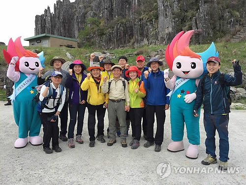 | △ 무등산에서 U대회 홍보 (광주=연합뉴스) 광주시는 3일 전날 진행된 올해 첫 무등산 정상개방 행사에서 2015하계유니버시아드대회 마스코트인 '누리비'가 등산객들을 상대로 U대회 홍보활동을 전개했고 밝혔다. 사진은 윤장현 광주시장과 홍보활동을 펼치는 누리비의 모습. 2015.5.3 <<광주광역시>> pch80@yna.co.kr |