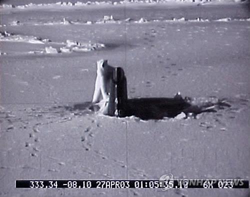 | △ 지난 2003년 4월27일 훈련중인 미국의 씨울프급 핵추진 잠수함 코네티컷호가 북극해 얼음 위로 일부 모습을 드러낸 것을 보고 북극곰 한 마리가 함 후미에 접근하고 있다.(AP=연합뉴스 자료사진) |
