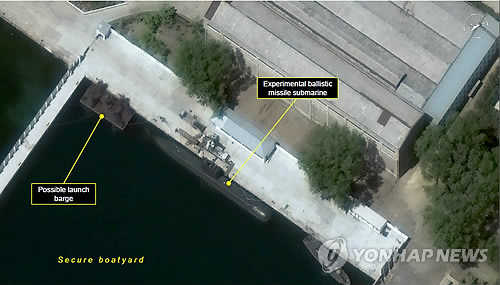 | △ "북한, 잠수함이 아닌 바지선서 미사일 발사" (워싱턴=연합뉴스) 노효동 특파원 = 북한 언론이 잠수함 탄도탄 수중발사에 성공했다고 발표한 직후인 지난 10일 미국 민간위성사진 업체인 디지털 글로브 사(社)가 북한 신포 조선소 전경을 촬영한 위성사진. 왼쪽 편에 보이는 바지선이 이번에 잠수함 탄도탄을 발사하는데 쓰인 것으로 알려졌다. 부두 가운데에는 탄도미사일 발사용 실험용 잠수함이 정박해있다. 2015.5.13 << '올소스 애널리시스' 조지프 버뮤데즈 선임연구원 제공 >> seephoto@yna.co.kr |