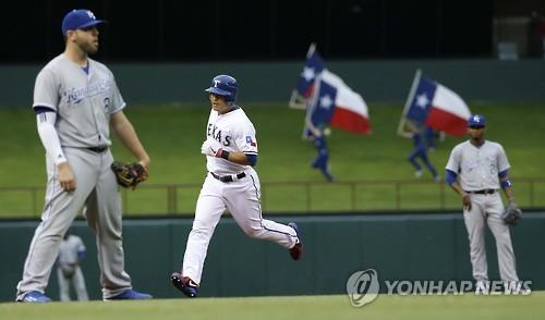 | △ 추신수(33.텍사스 레인저스)가 12일(현지시간) 캔자스시티 로열스와의 홈경기에서 1회 선두 타자 홈런을 친 뒤 베이스를 돌고 있다. (AP=연합뉴스) |