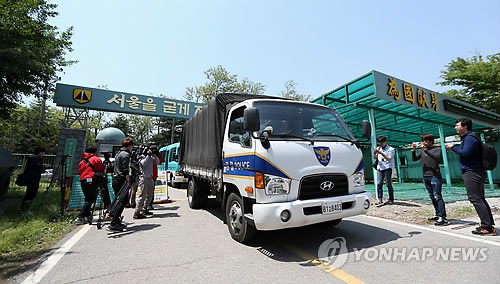 | △ 총기사고 부대 나오는 경찰 (서울=연합뉴스) 신준희 기자 = 13일 총기 사고가 발생한 서울 내곡동 예비군훈련장에서 경찰 병력이 나오고 있다. |