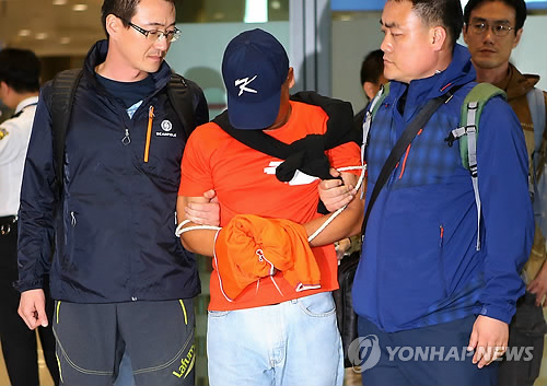 | △ 국내송환된 '안양 환전소 살인사건' 피의자 (영종도=연합뉴스) 최수향 기자 = '안양 환전소 살인사건' 피의자 김성곤씨가 13일 오후 인천공항을 통해 압송되고 있다. 김씨는 국내에서 살인을 저지르고 필리핀으로 도주했다 8년만에 국내로 송환됐다. |