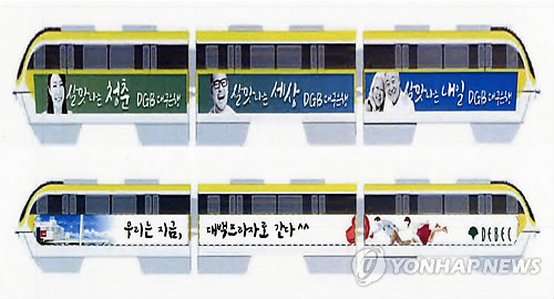 대구도시철도공사는 13일 대구은행과 대구백화점이미지 광고를 외부에 붙인 전동차 3대를 시범 운행하기 시작했다.