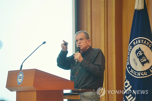 | △ 아론 시카노버 교수 한양대 특강 (서울=연합뉴스) 2004년 노벨화학상 수상자 아론 시카노버(Aaron Ciechanover) 이스라엘 테크니온공대 교수가 13일 한양대학교 백남학술정보관에서‘지속가능한 개발을 위한 과학기술'을 주제로 특강을 하고 있다. 2015.5.13 << 한양대 제공 >> photo@yna.co.kr |