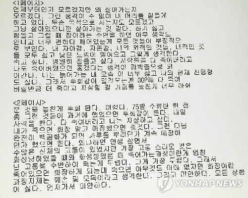 최 씨는 유서 곳곳에서 삶의 목적을 찾지 못해 정신적으로 방황하는 모습과 함께 자신에 대한 혐오감도 감추지 않았다.