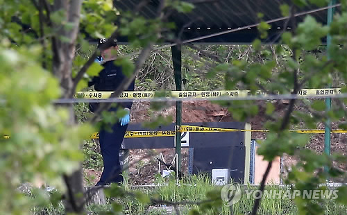 | △ 총기 사고 현장 (서울=연합뉴스) 한종찬 기자 = 13일 총기 사고가 발생한 서울 내곡동 예비군훈련장 사격장에서 수사 관계자가 전화통화를 하고 있다. 2015.5.13 saba@yna.co.kr |