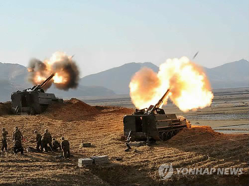 | △ 지난 2013년 3월 노동신문이 보도한 북한 김정은 국방위원회 제1위원장 참관하에 실시된 연평도·백령도 타격 포 사격훈련 장면. (연합뉴스 자료사진) |