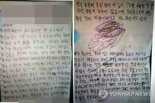 | △ 총기난사 가해자 유서 (서울=연합뉴스) 육군에서 13일 저녁 언론에 공개한 서울 내곡동 동원예비군훈련장 총기난사 가해자 최모씨 유서. 최모씨 유서 원본은 바지 우측 주머니에서 발견된 것으로 알려졌다. |
