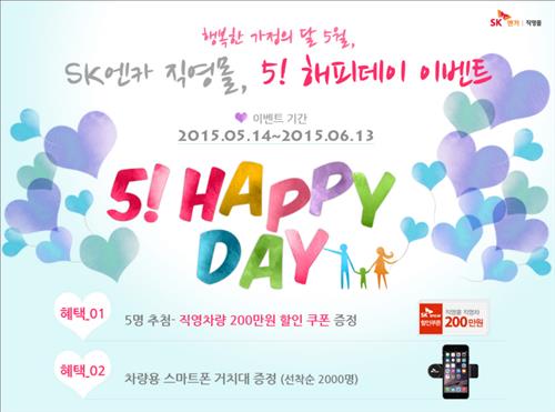 (서울=연합뉴스) 김윤구 기자 = SK[003600] C&C 엔카사업부는 가정의 달을 맞아 SK엔카가 직접 판매하는 차량을 200만원 할인해주는 '5! 해피데이' 이벤트를 한다고 14일 밝혔다.