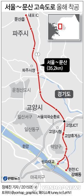 고양시 강매동에서 파주시 문산읍을 연결하는 서울-문산 고속도로(35.2㎞)의 총사업비는 1조5천억원이고 공사기간은 5년이다.