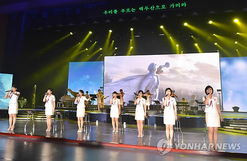 | △ 지난달 평양 인민문화궁전에서 열린 '조선인민군 제5차 훈련일꾼대회' 참가자들을 위한 모란봉악단 공연. (평양 조선중앙통신=연합뉴스 자료사진) |