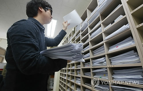 | △ 서울 종로구 신문로 한국납세자연맹에서 직원들이 검증을 마친 연말정산 환급서류를 정리하고 있다. (연합뉴스 자료사진) |