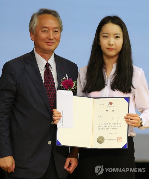 | △ 몽골 오양가씨 18회 한국어 말하기 대회 대상 (서울=연합뉴스) 황광모 기자 = 14일 오후 서울 경희대학교에서 열린 제18회 세계 외국인 한국어 말하기 대회에서 몽골 출신의 오양가(고려대 경제학과)씨가 대상을 수여받은 뒤 심사위원장인 최상진 경희대 교수와 기념촬영을 하고 있다. 세종대왕 탄신 618주년 기념으로 열린 이번 행사는 경희대학교 국제교육원과 연합뉴스가 공동 주최했다. 2015.5.14 hkmpooh@yna.co.kr |