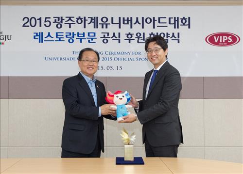 이날 오후 2015광주하계유니버시아드 조직위원회 회의실에서 김윤석 조직위 사무총장과 정문목 CJ푸드빌 대표이사가 공식 후원 협약식을 했다.