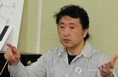 | △ (제주=연합뉴스) 고성식 기자 = 일본 오사카 코리안윈드오케스트라의 지휘자인 고창수(46)씨가 15일 제주청소년오케스트라 연습실에서 조부모의 고향인 제주에서 처음으로 자신의 곡을 들려주게 된 소감을 밝히고 있다. 재일교포 3세인 그는 제주의 시민밴드인 한라윈드앙상블 초청으로 오는 16일 오후 제주도문예회관 대극장에서 열리는 '망향의 친선 교류 연주회' 무대에 오른다. 2015.05.15 koss@yna.co.kr |