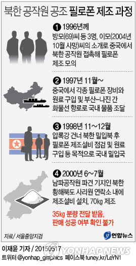 검찰에 따르면 이들은 2000년 6∼7월 북한 황해북도 사리원 연락소 내에 필로폰 제조설비를 차려놓고 70㎏의 필로폰을 만든 혐의를 받고 있다. 사리원 연락소는 남파공작원 파견 기지로 알려졌다.