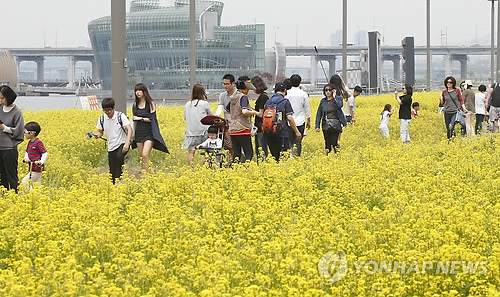 | △ 휴일 유채꽃 나들이 (서울=연합뉴스) 이상학 기자 = 17일 서울 서초구 서래섬에서 열린 '한강 서래섬 유채꽃 축제'에서 가족단위 나들이 시민들이 휴식을 취하고 있다. |