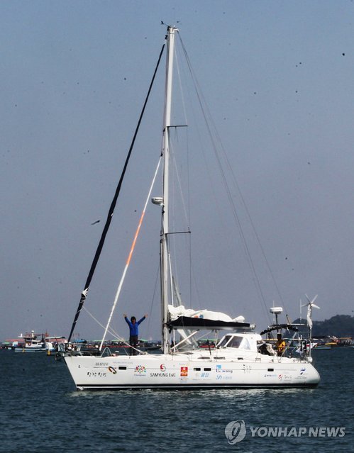 | △ '무동력 요트 세계일주' 김승진 선장 귀항 (당진=연합뉴스) 이재림 기자 = 우리나라 최초로 '무기항·무원조·무동력 요트' 세계일주에 성공한 김승진 선장이 16일 오후 충남 당진 왜목항에 요트를 타고 들어오며 손을 흔들고 있다. 2015.5.16 walden@yna.co.kr |