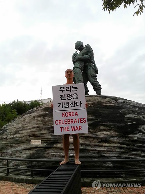 | △ 알몸으로 반전시위를 벌였던 강의석독립영화감독이 인터넷에 자신에 대한 비방 글을 올린 누리꾼들을 무더기로 고소했다. 지난 2013년 누드 시위 중인 강의석 독립영화감독 (연합뉴스 자료사진) |