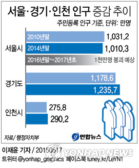 | △ <그래픽> 서울·경기·인천 인구 증감 추이 (서울=연합뉴스) 이재윤 기자 = 17일 행정자치부의 주민등록 인구통계에 따르면 작년말 서울시의 주민등록 인구는 1천10만3천233명으로 집계됐다. 2010년 말 서울시 주민등록 인구 1천31만2천545명과 비교하면 20만9천312명 줄어 이 추세가 앞으로도 지속된다면 내년말이나 2017년 초에는 '서울 주민등록 인구 1천만명'이 붕괴될 것으로 보인다. yoon2@yna.co.kr |