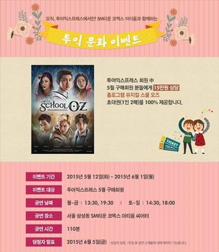 (서울=연합뉴스) 전준상 기자 = SM C&C 투어익스프레스는 6월 1일까지 여행상품을 구매한 모든 고객에게 홀로그램 뮤지컬 '스쿨오즈' 초대권을 증정하는 이벤트를 한다고 18일 밝혔다.