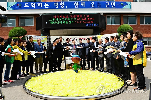 | △ 지구촌 사랑나눔 캠페인 (평창=연합뉴스) 지구촌 사랑나눔 캠페인 사랑의 점심나누기 행사가 12일 강원 평창군청 광장에서 심재국 평창군수를 비롯한 유인환 평창군의회의장, 김광식 평창경찰서장, 김재경 평창교육지원청교육장, 김중래 강원도민일보상임이사, 최헌영 월드비전 강원지회연합회 목사, 우용원 월드비전 평창군지회 목사 등과 봉사단체 회원 200여 명이 참석한 가운데 열렸다. 2015.5.12 <<평창군>> yoo21@yna.co.kr |