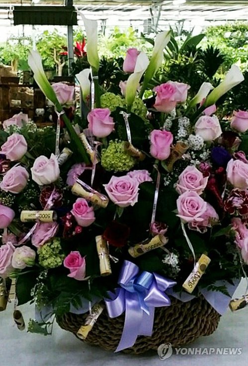| △ 보이스피싱에 활용된 현금 달린 꽃바구니 (서울=연합뉴스) 서울지방경찰청 지능범죄수사대는 전화금융사기(보이스피싱)로 가로챈 돈을 대포 통장이 아닌 멀쩡한 일반인의 계좌를 통해 받아챙긴 신종 사기 범죄단 인출책을 검거했다고 15일 밝혔다. 사진은 당시 범죄에 활용된 현금 달린 꽃바구니. 2015.5.15 kamja@yna.co.kr |