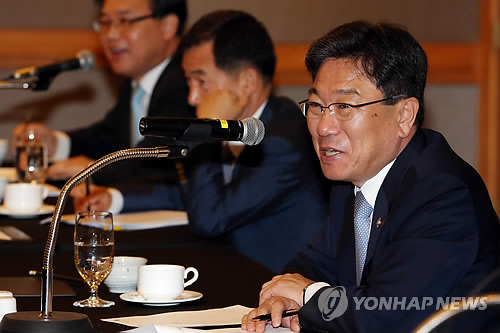 | △ 윤상직 산업부 장관, 경제연구원장 간담회 발언 (서울=연합뉴스) 홍해인 기자 = 윤상직 산업통상자원부 장관이 18일 오전 서울 반포4동 JW 메리어트 호텔에서 열린 주요 경제연구원장 초청 정책간담회에서 발언하고 있다. 2015.5.18 hihong@yna.co.kr |