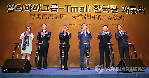 | △ 알리바바 T-mall 한국관 개통식 (서울=연합뉴스) 한종찬 기자 = 최경환 부총리 겸 기획재정부 장관(오른쪽 세번째)과 마윈 알리바바 회장(오른쪽 네번째)이 18일 오후 서울 서초구 aT센터에서 열린 '알리바바 T-mall 한국관 개통식'에서 클릭 세리모니를 마친 뒤 박수를 치고 있다. 오른쪽 두번째는 이동필 농림축산식품부 장관. |