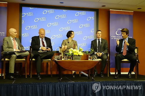 | △ KEI 주최 토론회 참석한 미국 무역전문가들 (워싱턴=연합뉴스) 김세진 특파원 = 18일(현지시간) 워싱턴DC에서 한미경제연구소(KEI) 주최로 열린 '동아시아 자유무역의 미래' 토론회에 참석한 미국 무역전문가들. 왼쪽부터 사회자인 트로이 스탠거론 KEI 연구원, 데릭 시저스 미국기업연구소(AEI) 연구원, 미레야 솔리스 브루킹스연구소 일본석좌, 제임스 파더리 한미재계회의 부회장, 에드워드 올든 미국외교협회(CFR) 선임연구원. 2015.5.19. smile@yna.co.kr |