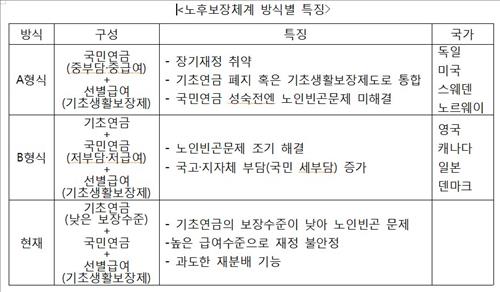 보고서는 해외의 노후보장 체계를 장기지속성과 빈곤완화, 제도 간 갈등 조정 측면을 살펴봤다. 이를 통해 독일, 미국, 스웨덴, 노르웨이 등이 채용한 A유형과 영국, 캐나다, 일본, 덴마크의 B유형 등 두가지를 가능한 개편 방향으로 제시했다.