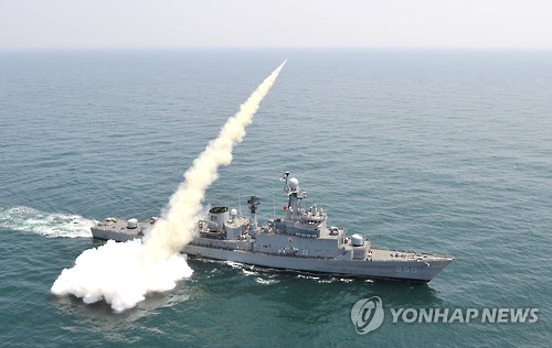 | △ 해군 마산함 유도탄 발사 훈련 (서울=연합뉴스) 해군이 19일 오전 경북 울진군 죽변 해상에서 전비 태세 향상과 북한의 해상 도발의지 분쇄를 위한 함대함 유도탄 발사 훈련을 하고 있다. (해군 제공) |