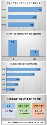 오너들의 이름을 살펴보면 우선 김씨 성(姓)을 가진 기업인이 40명(18.7%)으로 최다를 차지했다. 다음으로 이씨(33명), 박씨(16명), 정씨(14명), 조씨(10명) 순이다.