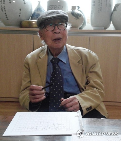 | △ 최고령 시인 황금찬 "문학상 생각 말고 최고의 시를" (서울=연합뉴스) 한혜원 기자 = 국내 문단 최고령 시인으로 꼽히는 황금찬(97) 시인이 오는 23일 제1회 황금찬문학상 시상을 앞두고 서울 도봉구 쌍문동 자택에서 이야기하고 있다. 그는 연합뉴스와 인터뷰에서 "후배 문인들이 문학상을 먼저 받아야겠다는 생각은 하지 말고, 최고의 시를 쓰겠다는 마음으로 임하라"고 당부했다. 2015.5.20 hye1@yna.co.kr |