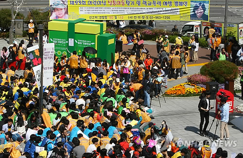 | △ 어린이날 실종아동찾기 및 학교폭력예방 캠페인 (서울=연합뉴스) 박영서 기자 = 어린이날인 5일 오전 서울 청량리역 광장에서 '제93회 어린이날 실종아동찾기 및 학교폭력·자살예방 캠페인'이 열리고 있다. 2015.5.5 conanys@yna.co.kr |