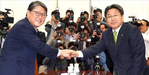 | △ 공무원연금특위 여야 간사 악수 (서울=연합뉴스) 도광환 기자 = 국회 공무원연금특위 여야 간사인 새누리당 조원진(왼쪽), 새정치민주연합 강기정 의원이 20일 오전 국회 안행위 소회의실에서 만나 악수하고 있다. |