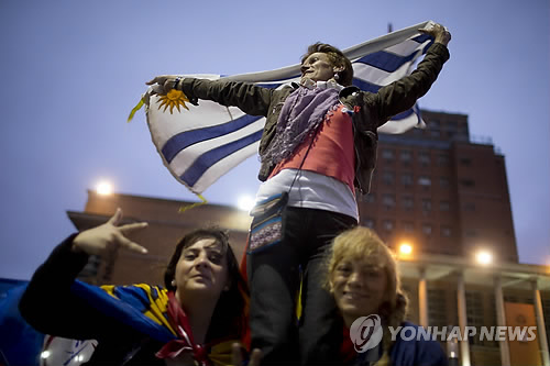 | △ 지난해 말 치러진 우루과이 대선 결선투표 출구조사 결과 중도좌파연합 프렌테 암플리오(Frente Amplio)의 타바레 바스케스 후보 당선이 확실해지자 수도 몬테비데오에서 바스케스 지지자들이 국기를 날리며 기뻐하고 있다. (AP=연합뉴스 자료사진) |