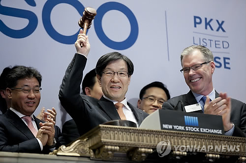 | △ 권오준 포스코 회장이 지난 2월9일(현지시각) 미국 뉴욕증권거래소(NYSE)에서 폐장을 알리는 타종을 하고 있다. <연합뉴스 DB> |