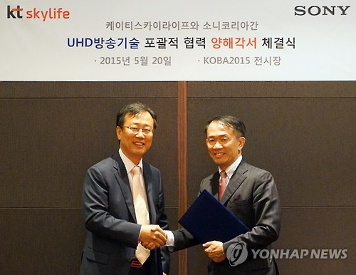 | △ KT스카이라이프, 소니코리아와 UHD 기술 협력 (서울=연합뉴스) 김윤수 KT스카이라이프 부사장(왼쪽)과 노다 케이치 소니코리아 프로페셔널솔루션 부문 사장이 지난 20일 서울 강남구 삼성동 인터컨티넨탈호텔에서 4K UHD(초고해상도) 장비 제공 및 기술 협력을 주 내용으로 하는 업무협약(MOU)을 체결하고 있다. 2015.5.21 << KT스카이라이프 제공 >> photo@yna.co.kr |