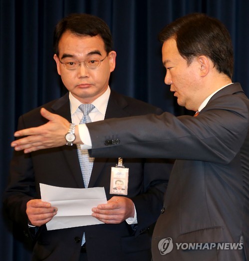 | △ 발표시간입니다 (서울=연합뉴스) 백승렬 기자 = 김성우 홍보수석이 21일 청와대 춘추관에서 황교안 새 국무총리 후보자를 발표하기 위해 기다릴 때 민경욱 대변인이 발표시간이 됐음을 알려주고 있다. |